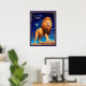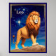 Poster no cartaz do zodiac Leo, com um poderoso leão parado orgulhosamente em uma rocha debaixo de um céu noturno estrelado. O homem fluente do leão irradia força e nobreza, ecoando os traços de confiança, liderança e coragem de Leo.