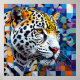 Representação estilizada da cabeça de um leopardo, mostrando cores vibrantes e padrões geométricos ousados no fundo. O leopardo é retratado de perfil, enfatizando suas características marcantes, como seus olhos âmbar penetrantes, bigodes proeminentes e padrões de manchas únicos. O fundo consiste em uma variedade de formas coloridas, criando um contraste dinâmico com as representações mais naturalistas do leopardo. O estilo geral mistura realismo com arte abstrata, dando-lhe um sentimento moderno e enérgico.