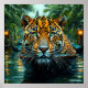 Vista impressionante e aproximada de um grande leopardo com uma face marcadamente viva, combinando elementos tanto de um tigre quanto de uma onça-pintada. Seu pelo vibrante laranja e preto contrasta com a exuberante folhagem verde que o cerca. O gato tem olhos verdes penetrantes que chamam a atenção, colocados contra o pano de fundo de uma via aquática calma e brilhante. Uma iluminação suave e atmosférica ilumina lanternas e plantas tropicais, criando uma atmosfera encantadora e misteriosa. No geral, a composição exala um senso de majestade e intriga, misturando vida selvagem com um ambiente sereno e pitoresco.