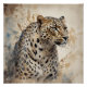 Um leopardo com uma aquarela detalhada com olhos expressivos é retratado contra um fundo macio e turvo. As cores naturais melhoram a aparência semelhante à vida.