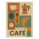 L’affiche est divisée en une grille modulaire composée de carrés et de rectangles aux proportions variées, chacun contenant une représentation stylisée : une tasse, un grain de café, une cafetière italienne, une cuillère, une horloge, un croissant. Chaque élément est dessiné en silhouette simple, unicolore, dans un style pictogramme. L’agencement joue sur le rythme et l’équilibre des formes, comme un jeu graphique. Les couleurs sont douces mais affirmées : terracotta, crème, brun, orange doux, vert sauge. Le mot CAFÉ est centré en bas, dans une case dédiée.
