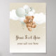 Adicione um toque suave e doce à decoração do seu chá de bebê com este Letreiro de Mesa de Ursinho de Pelúcia com Balões Sage Editável. Com uma ilustração de ursinho de pelúcia adorável combinada com balões modernos na cor verde sage, este design é perfeito para uma celebração temática neutra "We Can Bearly Wait" (Mal podemos esperar).