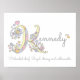Arte de monograma com letra inicial K, cartaz personalizado com nome perfeito para o quarto de uma menina em tons pastel de cinza, branco, amarelo, rosa e roxo. Personalize com o seu próprio nome começando com K e o significado do nome para um toque verdadeiramente personalizado no quarto ou berçário do seu filho, este exemplo é para o nome Kennedy. Capacete de chefe. Real, forte e entusiasmado. Impressão de cartaz fofo ideal para um novo bebê, batizado ou presente para chá de bebê. © Desenho e arte gráfica de monograma K exclusivo com corações e flores por Sarah Trett. www.sarahtrett.com para www.mylittleeden.com