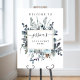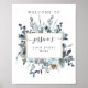 Sinal de boas-vindas elegante com a capacidade de adicionar qualquer evento, e lindo buquê floral envolvendo sua informação. 8" x 10" é apenas um exemplo, você pode escolher entre tamanhos maiores e menores. Folhas e flores em tons de azul poeira, azul-marinho, branco, cinza, salva e caramelo. Seu nome em caligrafia moderna e graciosa. Fácil de enquadrar ou alternativamente colar/agrapar em MDF resistente e barato. Parte da nossa coleção de casamento e eventos "Montanhas Azuis Rústicas".