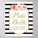 Letreiro de cabine de fotos pôster para chá de bebê, chá de noiva ou casamento em clássico padrão de listras pretas e brancas com borda dourada, flores cor-de-rosa rústicas e tons de pêssego em aquarela e letras em estilo manuscrito. Perfeito para um chá de bebê, casamento ou chá de noiva.