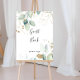 Este letreiro de caligrafia de eucalipto dourado para livro de visitantes é perfeito para um casamento rústico ou chá de noiva. Este design artístico apresenta folhagem dourada e verde desenhada à mão com aquarela, inspirando beleza natural.