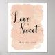 Este letreiro de mesa de sobremesas de casamento, com seu fundo em aquarela rosa claro e escrita caligráfica e itálica, é uma maneira linda de decorar a mesa de doces no casamento.