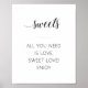 Este adorável letreiro de doces, com a sua moderna caligrafia preta dizendo "tudo o que você precisa é amor doce amor", é perfeito para adicionar à mesa de sobremesas do seu casamento. Isto faz parte da coleção Alejandra.