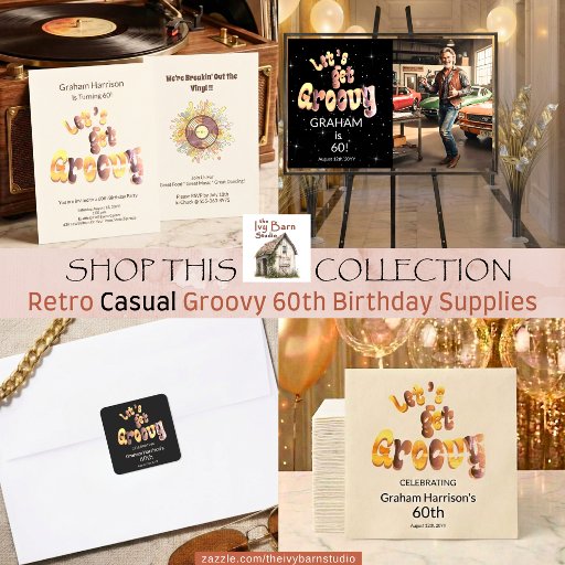 60th birthday party personalized with name and date Welcome Poster to kick off your sixtieth birthday party celebration! Pick your favorite photo of yourself or your spunky spouse/friend who's turning 60 and Add Your Photo! (This design works great for both men and women!) The words "Let's Get Groovy" are custom designed using trending Retro with its "distressed" shades of Orange, Red, Brown, with a nice neutral beige background for the more casual person... Fun, classy and stylish!