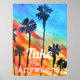 Praia do pôr do sol com palmeiras paisagísticas pintando aquarela do artista Sacha Grossel com viagem, me leve a qualquer lugar. Slogan viagem com citação inspiradora. Surf tema arte na praia.