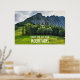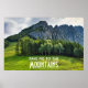 Esta poster apresenta uma imagem de uma montanha no norte da Itália com uma floresta de pinheiros num dia de verão nublado. A legenda diz "Leva-me às montanhas".