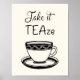 Aqui está um adorável poster de chá para todos os seus bebedores de chá lá fora! A design apresenta uma equipe desenhada manualmente com a citação "Tome-a TEAze" sobre um fundo creme.