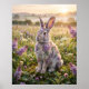 Um charmoso coelho lilás senta-se alerta em um prado radiante onde as flores da primavera se encontram com a beleza suave da vida selvagem. A anatomia realista do coelho se mistura com flores lilás fragrantes, texturas folhosas, pelo macio e sotaques botânicos pastéis nas orelhas, ombros, costas e cauda. Grama orvalhada, pétalas flutuantes, luz quente do nascer do sol e sebes distantes criam um cenário alegre no campo. Este doce design de fantasia da natureza traz suavidade e calor para berçários, quartos, interiores de primavera ou coleções de presentes. Perfeito para amantes de coelhos, fãs de decoração floral e espaços com estilo cottagecore.