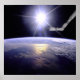 Vista do efeito final do Sistema de Manipulador Remoto (RMS) sobre um membro da Terra com um padrão de explosão solar atrás dele.