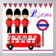 Um poster de pintura tão fofo em branco e azul vermelho, Londres Pensava com três pequenas Guardas da Rainha do Palácio de Buckingham em fila; sob bandeiras do Union Jack Bunting. Um texto em Londres com o famoso símbolo London Eye e um ônibus vermelho de dois andares no ponto de ônibus. Uma imagem muito britânica de diversão e moda; uma favorita com meninos.