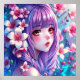 Menina de anime bonito com cabelo roxo e flores brancas hiper realista ai art poster.