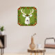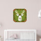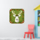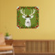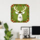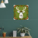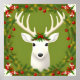 Ilustração detalhada de um cervo com chifres em uma paisagem serena e nevada com vegetação e cogumelos.
