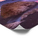 Poster com uma fotografia encantadora com cores marcantes de roxo, azul e rosa no pôr do sol. Uma bonito linha costeira espalhada por rochas.