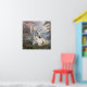 Uma doce arte de parede temática de conto de fadas mágico. Um lindo unicórnio com um chifre e olhos dourados sentado sob um arco-íris perto de um castelo.