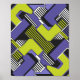 Este desenho abstrato é composto por formas geométricas interligadas em tons negros de roxo e verde, contrastadas com linhas pretas e brancas. A repetição e a simetria criam um padrão dinâmico que se parece com murais modernos ou designs digitais futuristas. As arestas vivas e contrastes vívidos dão à trabalho de arte uma sensação de movimento, ritmo e harmonia estruturada.