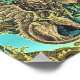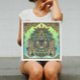 Uma ilustração visualmente impressionante e intrincada que representa uma figura poderosa e blindada cercada por leões alados e ornamentados, elementos decorativos. O capacete da figura é adornado com chifres e penas, e seus olhos brilham com uma luz intensa.
