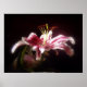 Feche a foto de um lírio de stargazer cor-de-rosa e branco, manchado em fundo preto. Um grande nódulo floresce na luz do sol brilhante enquanto outro floresce se esconde subjugado nas sombras além de um eco ou reflexão.