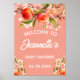 Greet your guests with the warmth of a sun-drenched orchard using this botanical welcome poster. The design showcases lush watercolor peaches and soft pink blossoms against a coral background. This is a beautiful choice for the entrance of a "Sweet Little Peach" baby shower or a summer garden celebration.