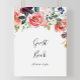 Este sinal de livro de visitas floral colorido e tropical de verão é perfeito para um casamento simples ou chá de noiva. O design apresenta flores elegantes ilustradas em branco, rosa, rosado, burgundy e roxo, organizadas em belos buquês com folhagens verdes.