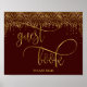 Este simples e elegante cartaz do livro de hóspedes com fundo burgundy, confete de ouro e caligrafia é ideal para o teu casamento.