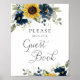 Sinal de Livro de Presença para Casamento Floral Girassóis Azul Naval Verde. Sinalização de Casamento Rústico Floral.