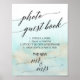 Este sinal de livro de visitas de foto de praia em aquarela aqua e dourado é perfeito para um casamento em um destino tropical. O design simples e moderno apresenta uma impressionante aquarela turquesa, azul esverdeado e azul claro com um brilho suave dourado que lembra a areia e o mar. Está combinado com uma caligrafia elegante e linda.