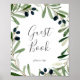 Este livro de visitas de galho de oliveira moderno é perfeito para um casamento boho. O design rústico e elegante apresenta folhas verdes botânicas simples em aquarela e azeitonas pretas em um pequeno galho com um toque mediterrâneo clássico.