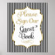 Um elegante letreiro de barra de livro de visitas preto e dourado que diz "Por favor, assine nosso livro de visitas". Este letreiro de mesa clássico apresenta listras pretas e brancas e uma moldura com acento de brilho dourado. A decoração perfeita para sua festa de casamento, chá de bebê, chá de noiva ou festa de aniversário. Mais letreiros de mesa e decorações de festa podem ser encontrados em minha loja.