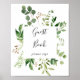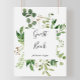 Este sinal de livro de visitas floral marrom simples de eucalipto é perfeito para um casamento de folhagens ou chá de noiva. O design apresenta belas folhas verdes de eucalipto pintadas à mão artisticamente e dispostas em formas geométricas, inspirando beleza natural.
