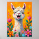 Acelere seu espaço com esta vibrante e alegre ilustração de lama! Apresentando uma alegre lama branca com bochechas rosadas e um sorriso largo e dentado, este trabalho de arte branco é colocado contra um fundo alaranjado que explode com flores coloridas. Tulipas cor-de-rosa, margaridas alegres, e lenafy greenery enquadram a lhama feliz, criando uma vibração animadora e brincalhona que certamente faz qualquer um sorrir. A textura paintada e as cores ousadas dão vida à cena. Esta charmosa obra de arte digital combina beleza, humor e talento artístico de uma forma divertida e na moda. Ideal para amantes de os animais, entusiastas de lama, ou fãs de arte bonitinha e colorida, também faz um presente delicioso.