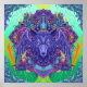 Um lobo majestoso, alado ocupa o centro da imagem, seus olhos piercing e sua expressão determinada transmitindo um sentido de poder e nobreza. Ao redor do lobo estão padrões complexos, ornamentados, incluindo anjos, crânios, chamas e uma faixa com símbolo.