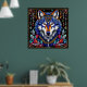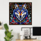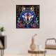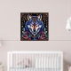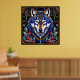 Cabeça de lobo estilizada, caracterizada por padrões intrincados e cores vibrantes. O pelo do lobo é predominantemente uma mistura de azul e branco, com sotaques laranja brilhantes destacando o rosto e os ouvidos. Em volta do pescoço, há uma corrente decorativa que adiciona um toque de ornamentado. O fundo é embelezado com várias formas coloridas, incluindo cristais e folhas, que reforçam o sentimento místico e artístico geral da peça. Além disso, elementos decorativos, como miçangas e ornamentos, penetrem das laterais, contribuindo para uma atmosfera boêmica.
