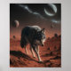 Lobo no Planeta Alienígena - Um lobo solitário com uma cinza e casaco branca atravessa uma paisagem estéril e vermelha. Os olhos âmbar do lobo estão focados no chão, e seu pelo é esmagado pelo vento. O fundo apresenta um céu escuro e estrelado com meia lua e vários outros corpos celestes. A cena evoca um sentimento de isolamento e mistério, sugerindo um mundo desolado e alienígena.
