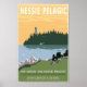 Poster de estilo WPA do monstro de Loch Ness a respirar no oceano aberto com um farol no fundo. Viva o Nessie livre!
