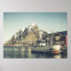 Um navio no cais de Reine, uma aldeia tradicional de pesca na costa das Ilhas Lofoten, no Norte da Noruega, Escandinávia.