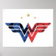 Mulher Maravilha | Logotipo da Mulher Maravilha dividida em Vermelho e Azul, sobreposto com ilustrações em quadrinhos modernas e clássicas.
