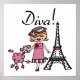 Diva T-shirts, fatos-chave, canecas, bolsas, cartas, autocolantes, correntes-chave, travesseiros, relógios de parede, e muito mais com uma design de diva fofa, com uma menina cabeleira loira num chapéu e um vestido cor-de-rosa com o seu poodle rosa perto da Torre Eiffel!