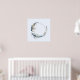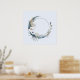 Poster com uma ilustração mística. Uma lua azul escura com um contorno fino elegante e flores brancas ao longo das suas bordas.