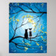 Dois gatos sentados em um galho observando a lua de cheio com um céu azul cheio de estrelas. Os ramos das árvores ao seu redor com pequenas flores amarelas. Gato de tuxedo preto e um gato branco bicolor e cinza pintado. Pintura acrílica branca moderna original de Donna Leger. Todos os Direitos Reservados. ©irony designs