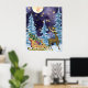 Ilustração mágica de uma rena com trenó em uma floresta com árvores de Natal, coberta de neve e iluminada pela luz da lua de cheio no céu estrelado.