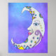 Decorem a vossa casa com esta poster de trabalho de arte econômica que tem uma lua crescente branca fantástica com um rosto e olhos azuis com decorações bonito e coloridas em azul, amarelo e roxo num céu azul e roxo com estrelas pontilhadas.