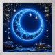 Cena noturna caprichosa apresentando uma lua crescente brilhante iluminada com luz neon azul. Suspenso de cima estão estrelas cintilantes, criando uma atmosfera mágica. O primeiro plano deve mostrar pedras texturizadas adornadas com delicadas luzes de fada, realçando o clima encantador. Azuis profundos e acentos metálicos para evocar uma paisagem celestial sonhadora.