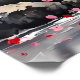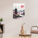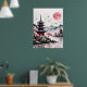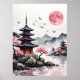 Esta pintura representa uma dramática paisagem japonesa sob uma grande lua rosa brilhante. Um pagode multicamadas se posiciona em uma ilha rochosa, com um pagode menor visível na pequena distância. As pétalas de flores de cereja estão espalhadas na água e no chão, aumentando a atmosfera romântica. Um bando de pássaros negros voa através do céu iluminado pela lua, criando uma sensação de movimento e profundidade.