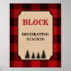 Block Decorating Station Sign - apresenta um design vermelho de lenhador de xadrez para o seu chá de fraldas.
