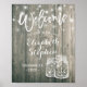 Modelo de Cartaz de Sinal de Recepção de Casamento - Jarro de Pedreiro Elegante e Luzes de Corda em Fundo de Madeira Rústica.